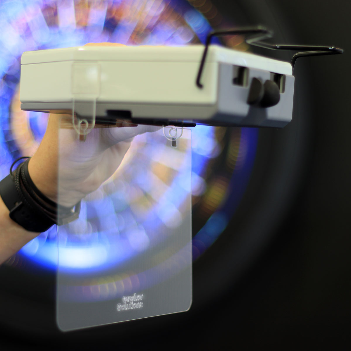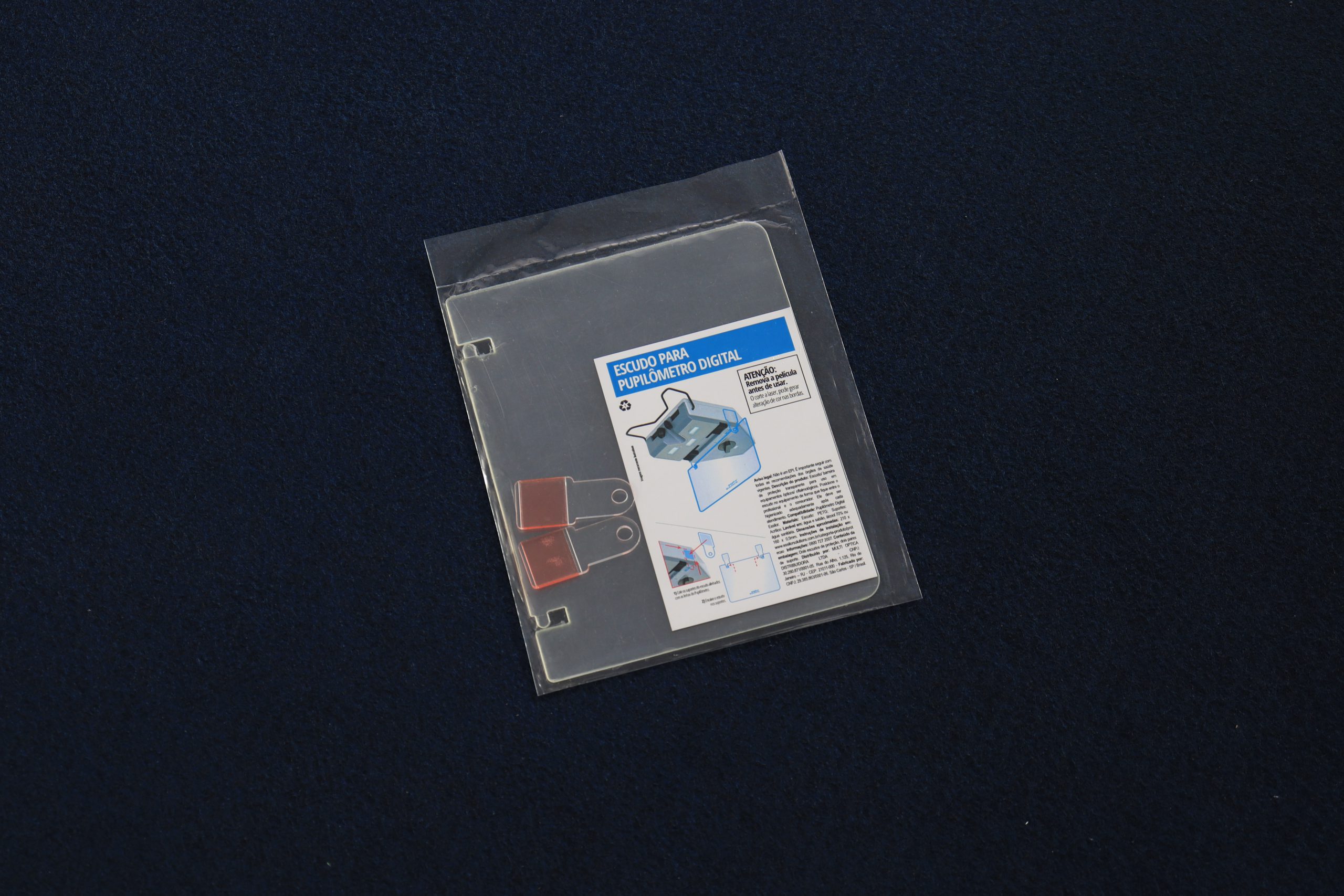 Escudo confeccionado em PETG removível, com suportes em acrílico para pupilômetro Digital Essilor. Com dimensões 210 x 160 x 0,5mm.