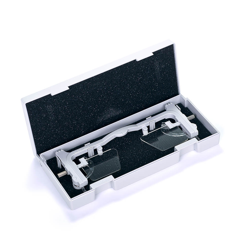 - Centralize o eixo do aparelho. Posicione a linha branca no centro da pupila, utilizando os dois botões giratórios nas laterais do aparelho. Leia a graduação tangencial na parte inferior da armação e anote a altura pupilar, levando em conta a profundidade da faceta.
